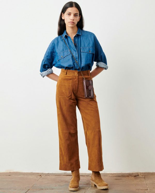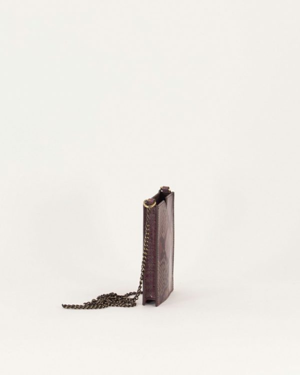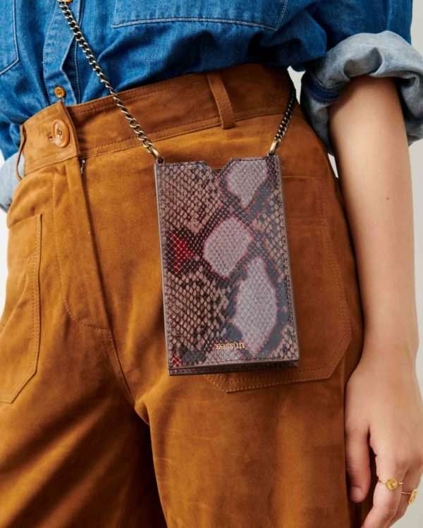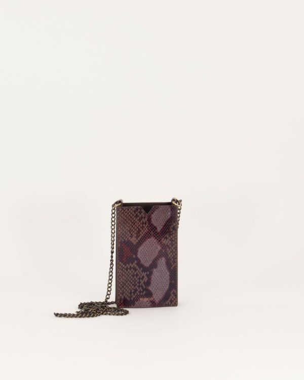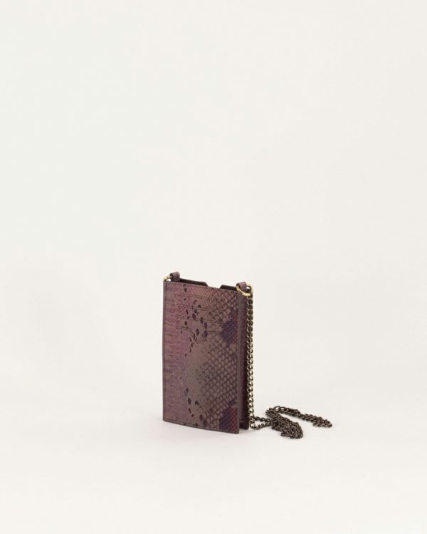 Ama Pyth phone pouch in a patchwork of leather and split leather.
