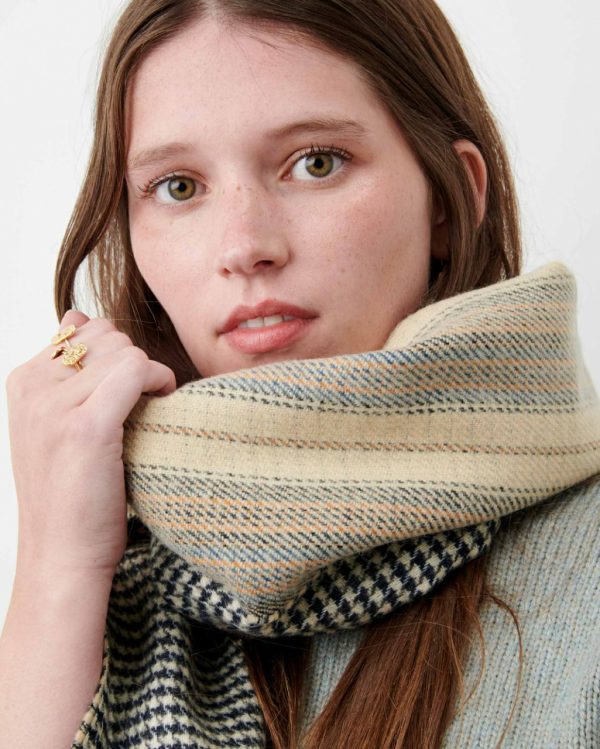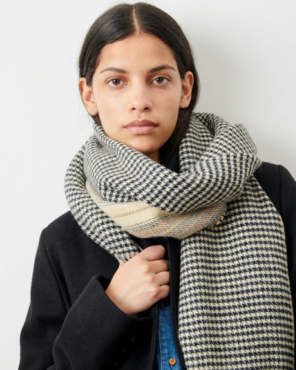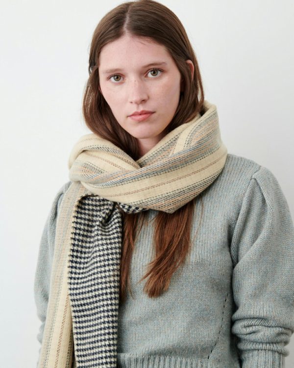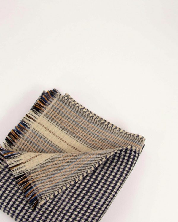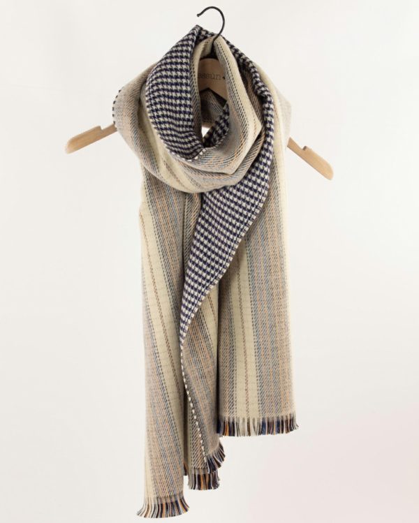 Sheldon double-sided large scarf: houndstooth pattern on one side and fancy stripes on the other side.