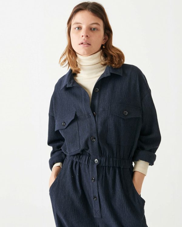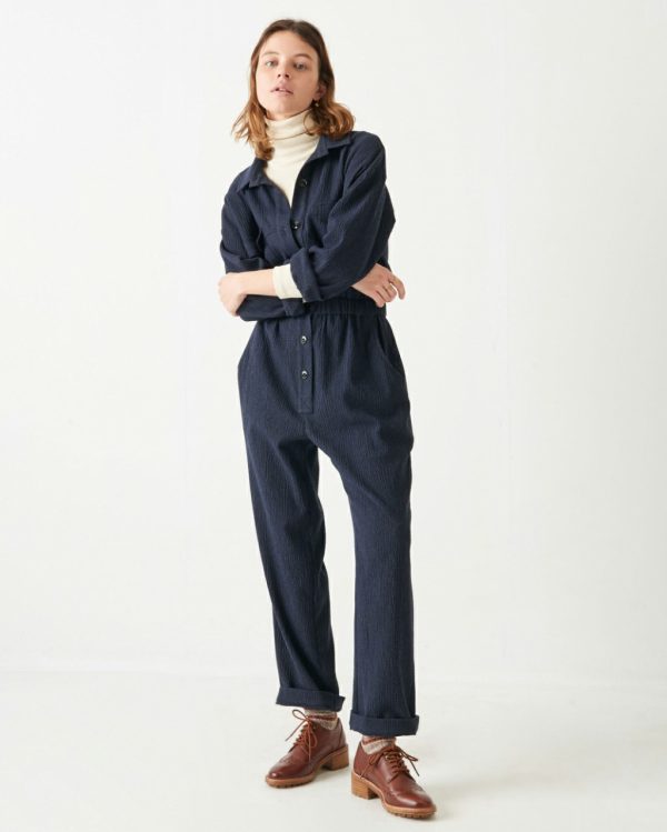 Wilpena loose-fitting worker jumpsuit in tennis striped seersucker flannel woven in Italy.