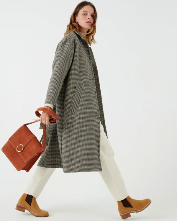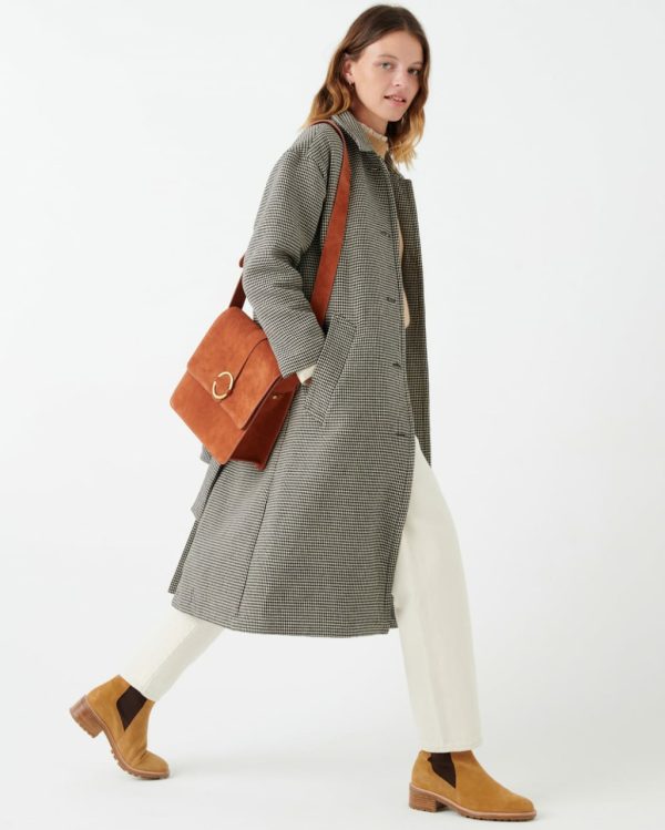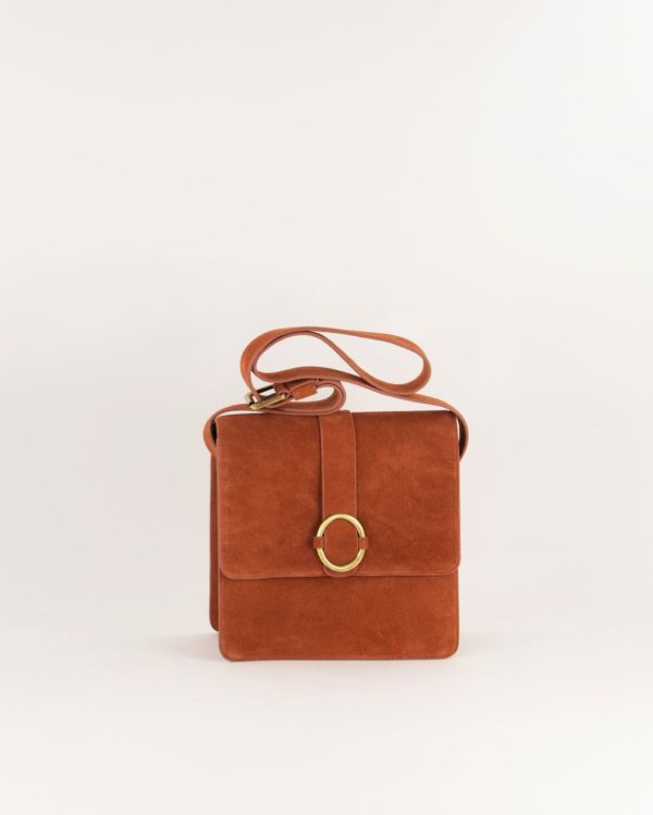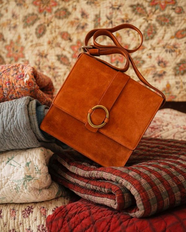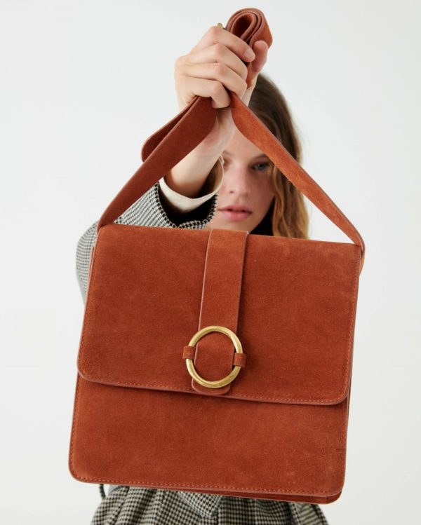 Flap lined with split leather, leather tab with decorative metal buckle.
