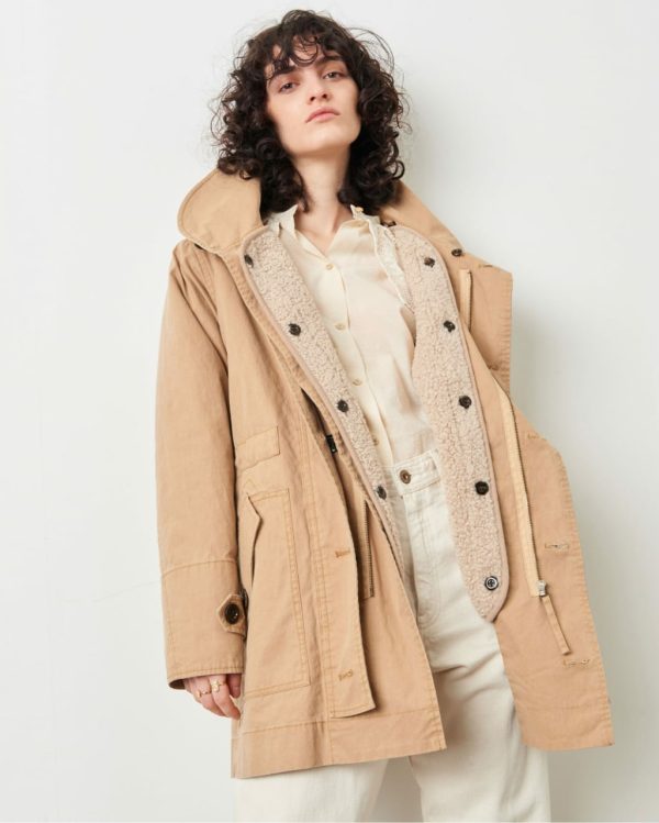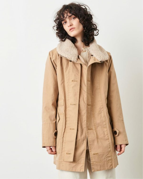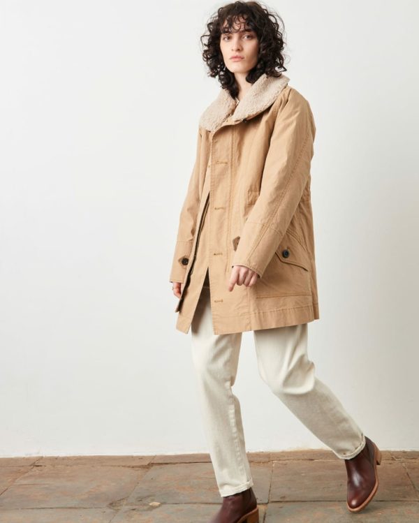 Contrasted false sheep fur details on collar and lining.