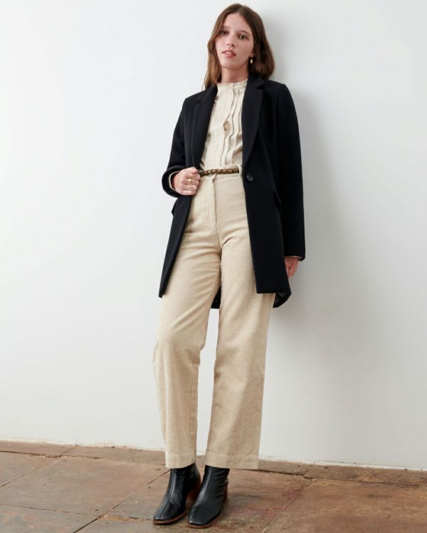 Tailored collar, double-breasted button closure in front.