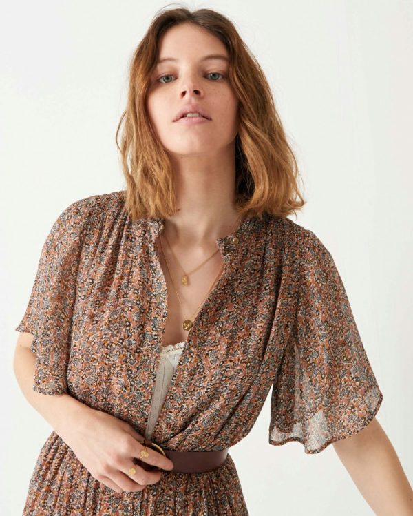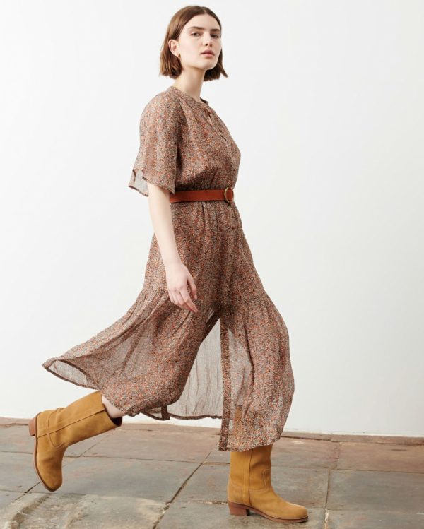 Denise long dress in printed creped viscose chiffon, exclusive Sessùn motif.