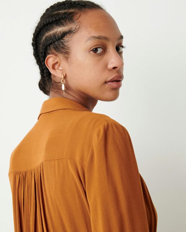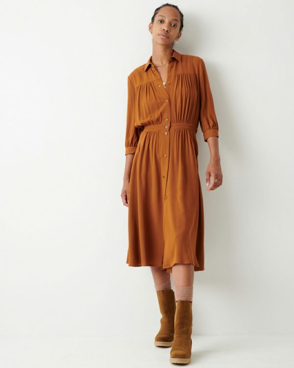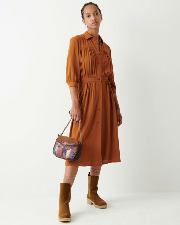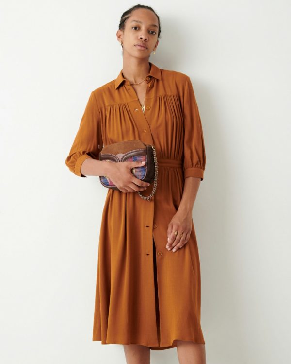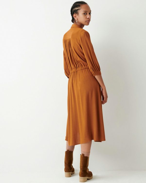Jeanneton shirt dress in crepe. Closure with tone-on-tone buttons. Cutout details on chest. Fitted waist elasticated on back. 3/4 sleeves with fitted cuffs. Side pockets in front. Gathered effect on chest, waist and sleeve ends. Midi length.