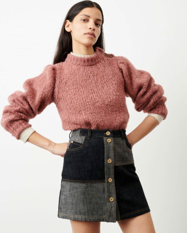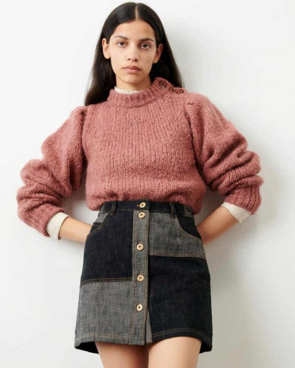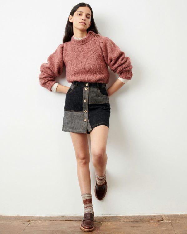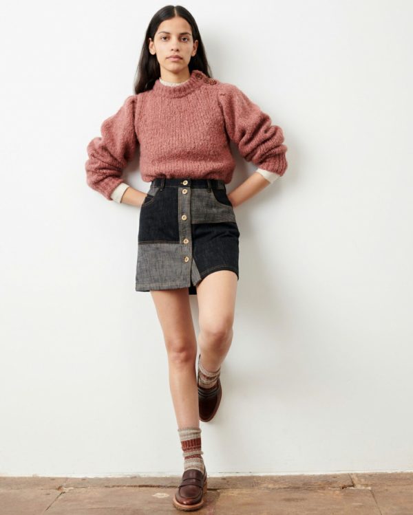 Baby Doo buttoned mini skirt in denim-style twill cloth, woven in Italy.
