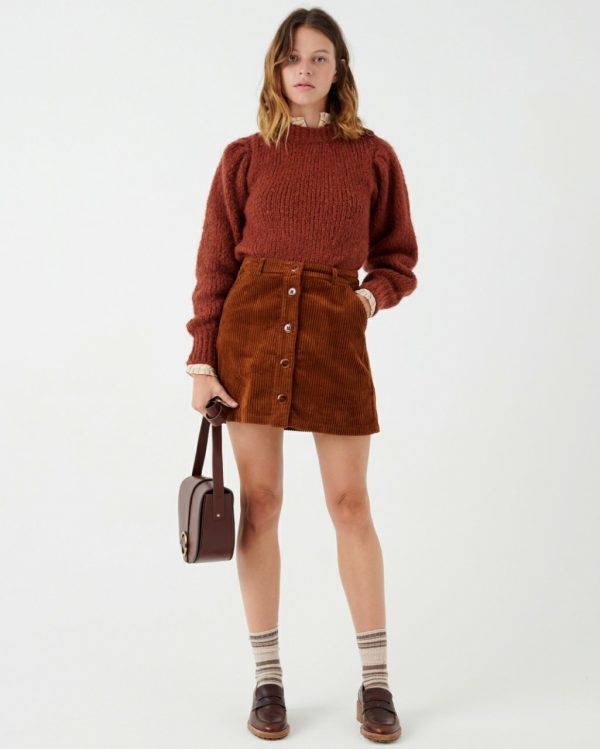 Simone A-line mini-skirt in 14-wale corduroy, woven in France.