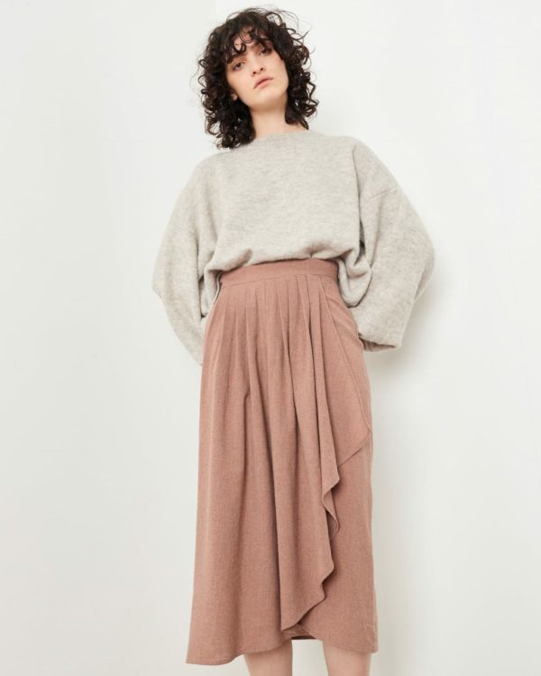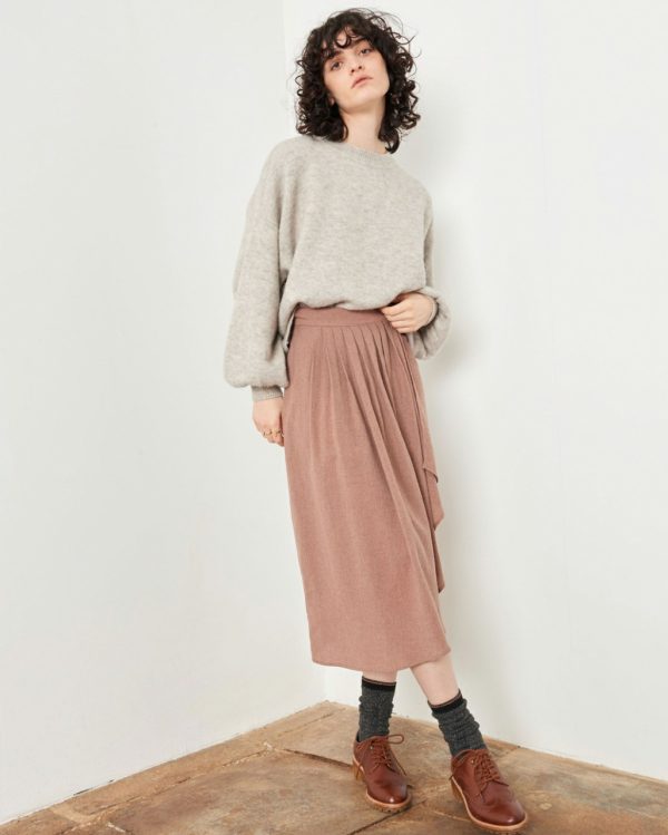 Soul Sister wrap-around mid-length skirt in chambray etamine woven in Italy.