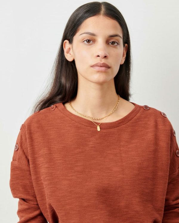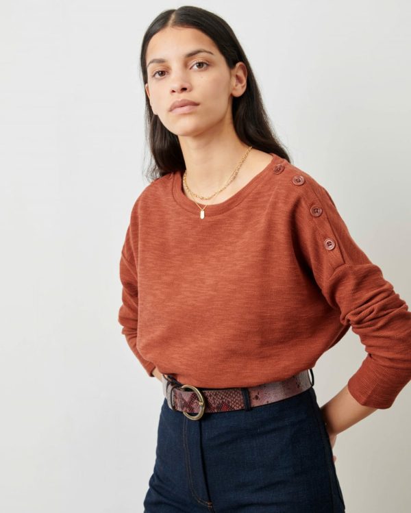 Austin long-sleeve T-shirt, knitted and crafted in Portugal. Interlock slub yarn jersey. Crew neck. Buttoned placket on shoulder. Dropped sleeves. Small side slits.